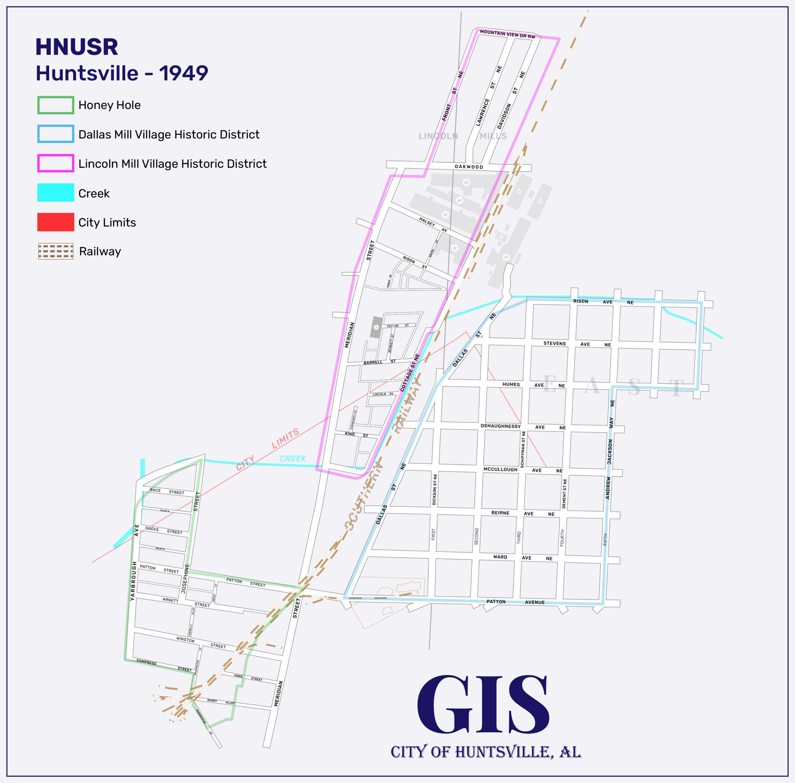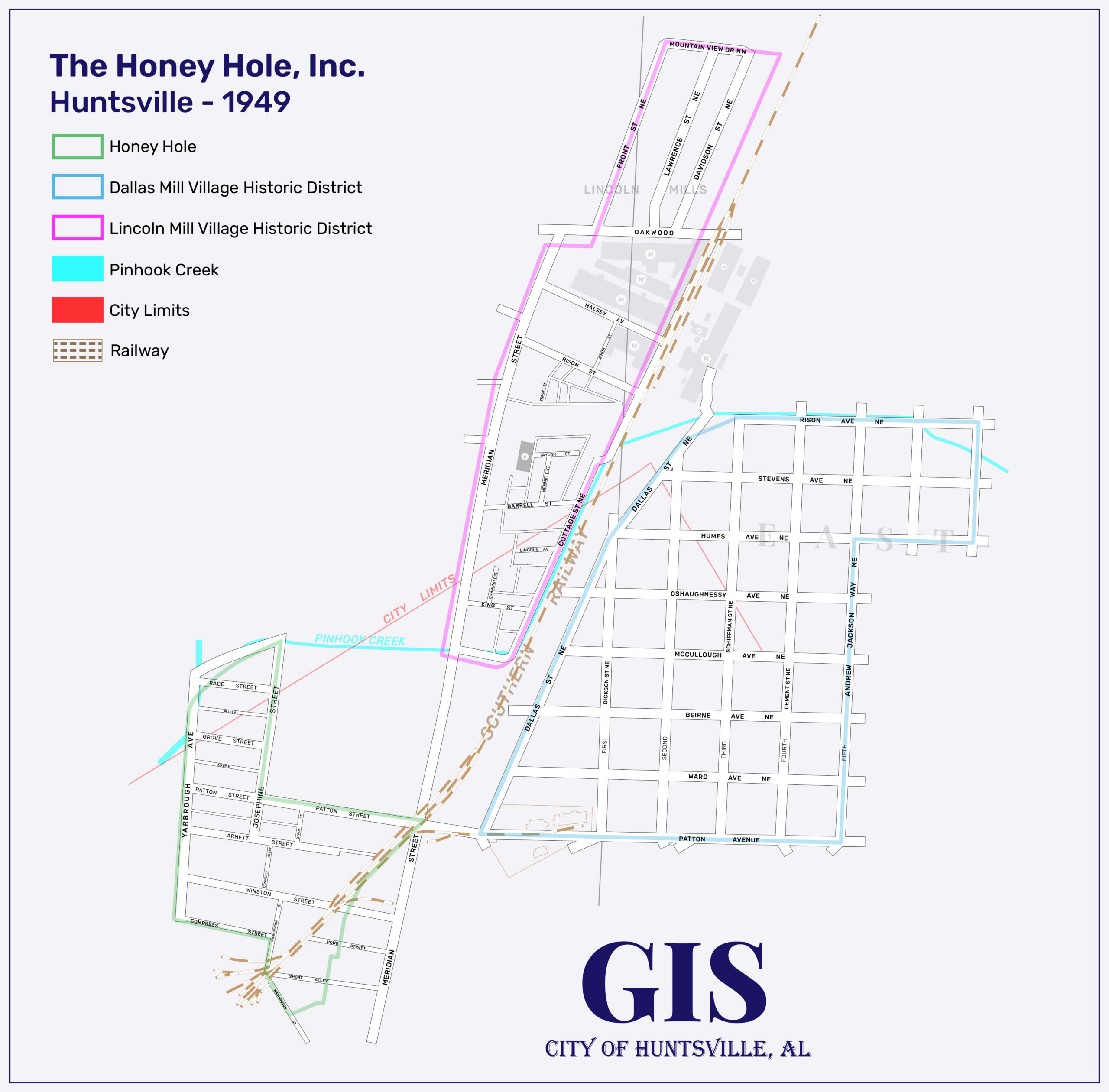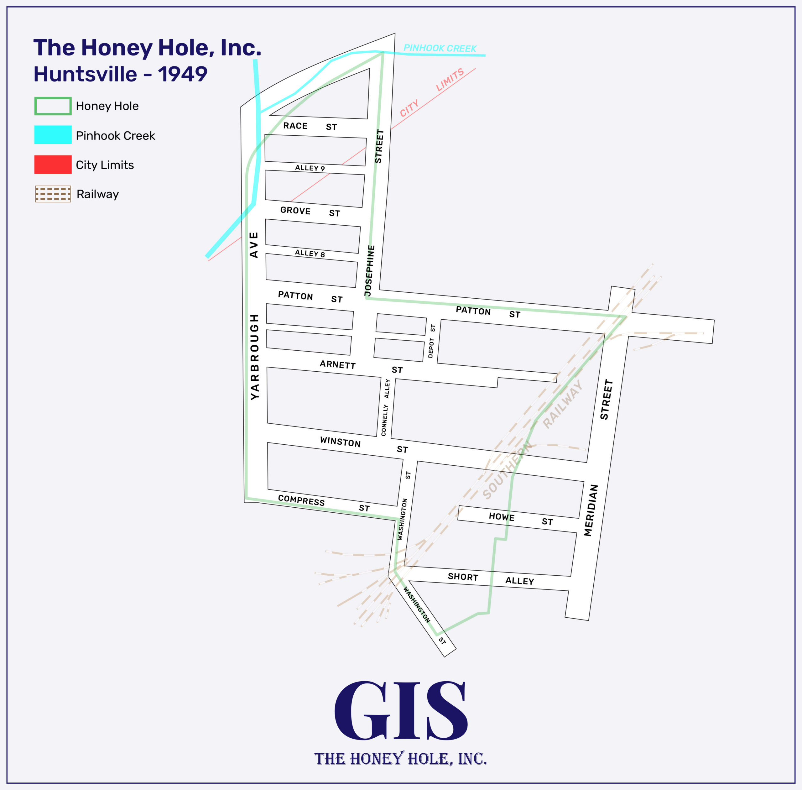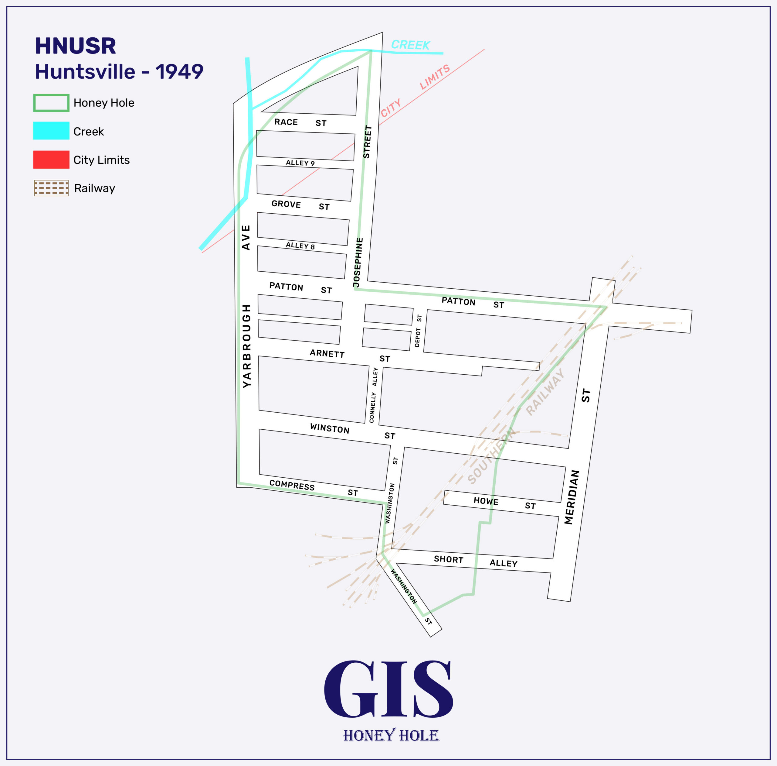 The Honey Hole community was demolished as part of the Winston Street Urban Renewal Project approved by the federal government on July 10, 1957. The government also authorized at that time a $1,343,723 loan at 3.75% interest for the urban renewal project. The 40-acre, Winston Street area demolished was “bounded by Yarbrough Avenue on the west; by a drainage canal and Patton Street on the north; by the Southern Railroad tracks, Josephine Street and a line west of Meridian Street on the east and by Washington Street and the Southern Railway tracks on the south.” Families were moved out of the neighborhood and the Huntsville Housing Authority began burning the houses down in the Honey Hole community on December 16, 1958.